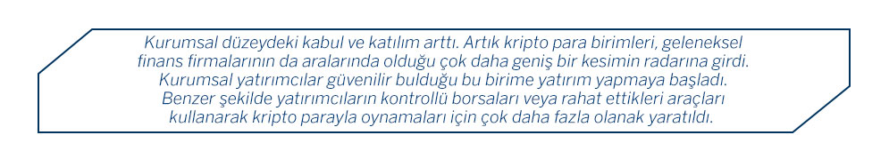 - Kurumsal düzeydeki kabul ve katılım arttı. Artık kripto para birimleri, geleneksel finans firmalarının da aralarında olduğu çok daha geniş bir kesimin radarına girdi. Kurumsal yatırımcılar güvenilir bulduğu bu birime yatırım yapmaya başladı. Benzer şekilde yatırımcıların kontrollü borsaları veya rahat ettikleri araçları kullanarak kripto parayla oynamaları için çok daha fazla olanak yaratıldı.